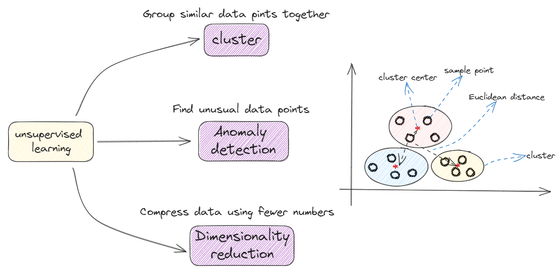 Learns from being given “no-right answers(unlabeled data)”, data only comes with inputs x, but not output labels y. Algorithm has to find structure automatically in the data and automatically figure out whether the major types of individuals.