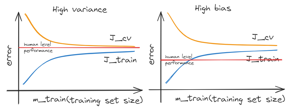 - High bias(under fit): $J_{train}$ will be high($J_{train}\approx J_{cv}$)